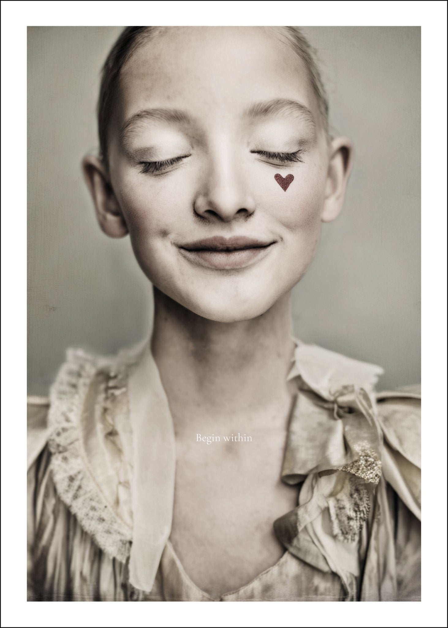 The image captures a moment of quiet alignment, where attention turns away from the surrounding world and settles inside. The small heart mark becomes less a symbol and more a trace — something gently acknowledged rather than displayed.