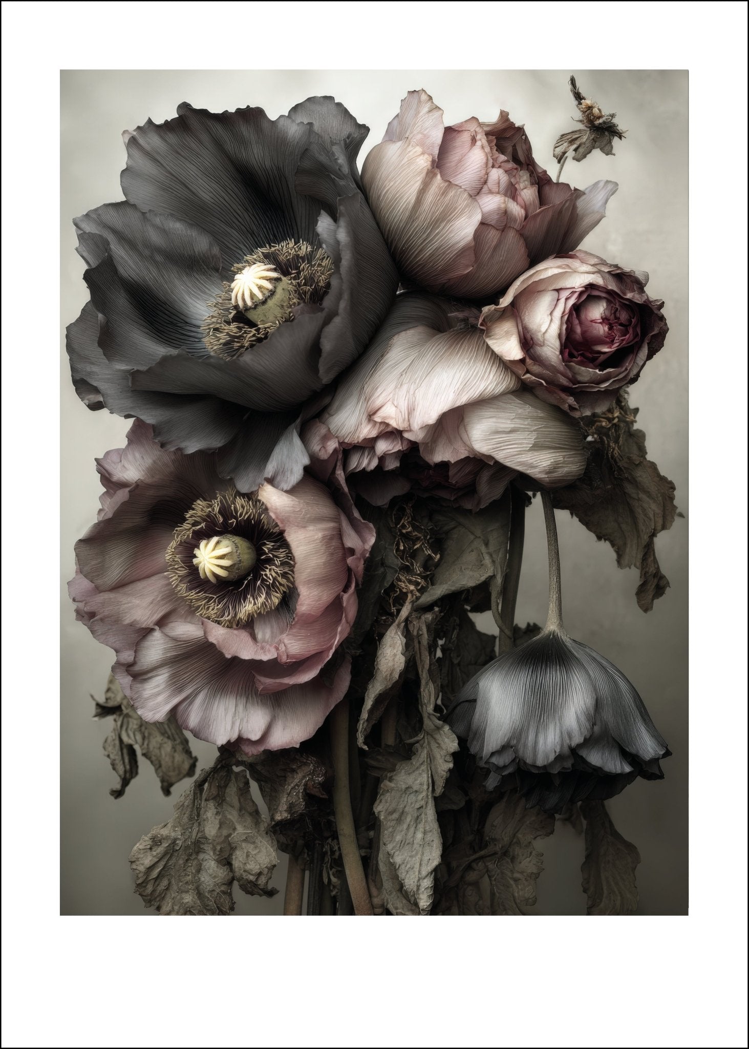 Soft pinks, smoky charcoal, and paper-thin petals caught in their most honest moment. Pink Bouquet is a fine art floral still life that celebrates imperfection — the slow beauty of things fading, changing, becoming.
